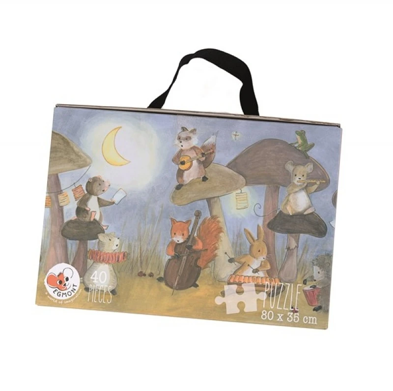 40 grandes pièces d’un puzzle de sol en carton fort sont à assembler pour recomposer le grand dessin des musiciens. Pratique cette jolie valise pour tout ranger!