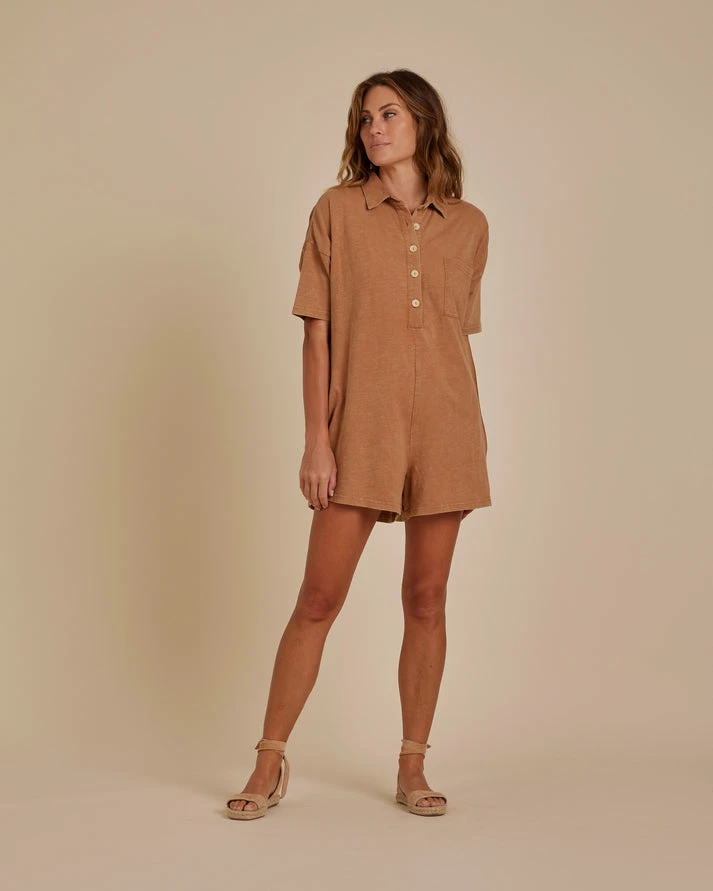Cette nouvelle barboteuse à col est la combinaison parfaite de confort et de fantaisie. Avec des boutons de mangue le long du devant central pour une coupe ample, faites-en un incontournable. Avec notre couleur « camel ».